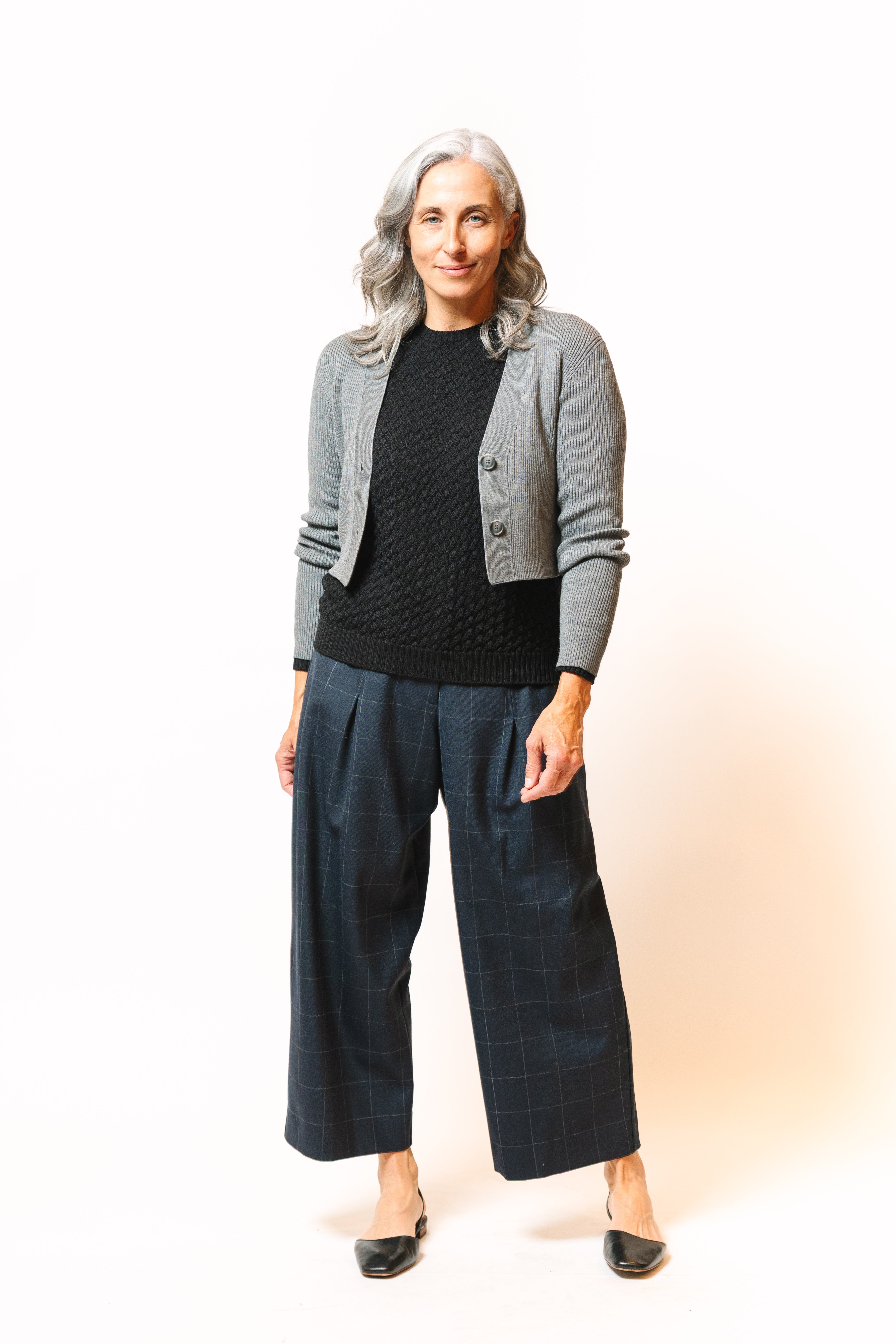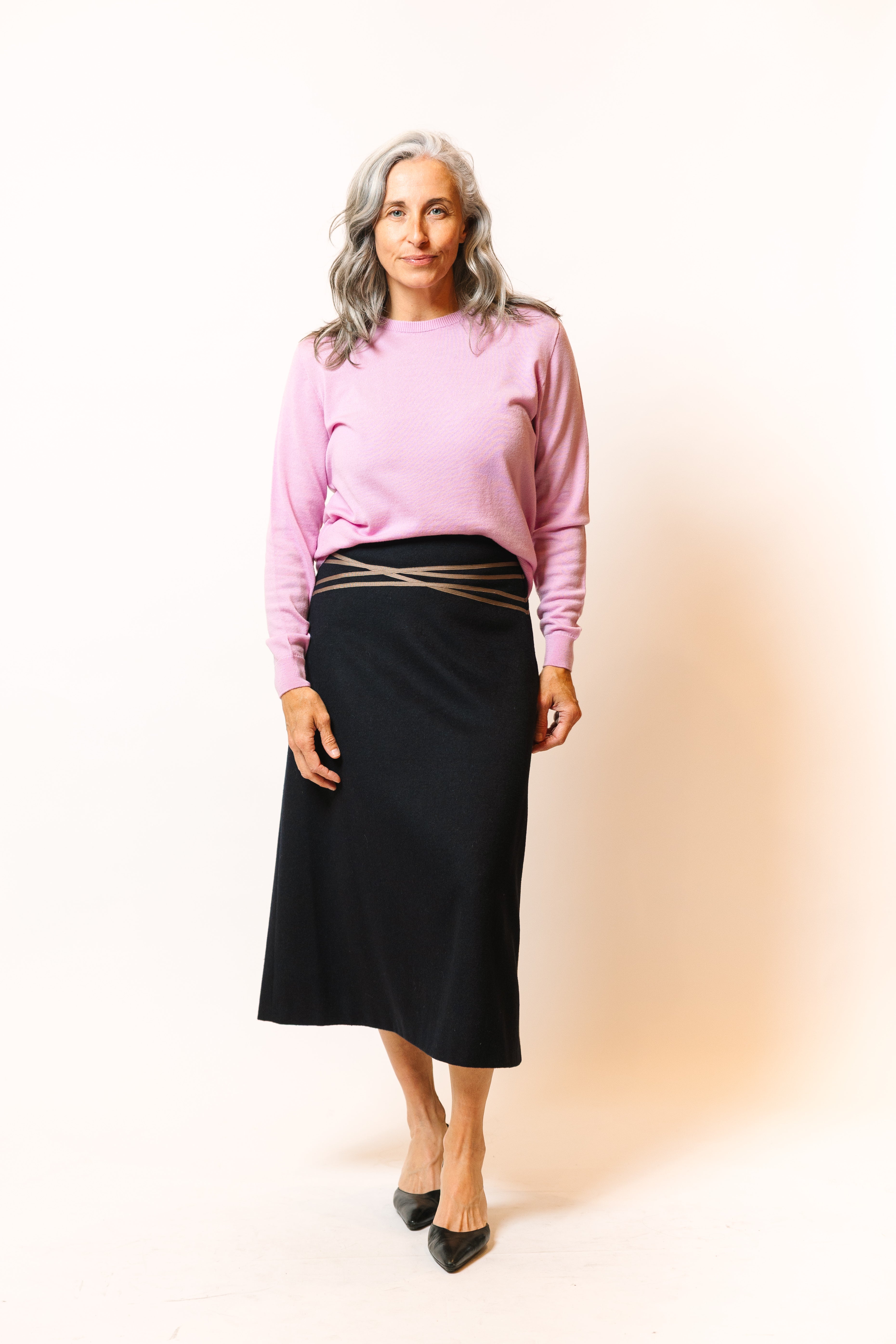 The Winter white taffeta is a fabulous cold weather piece. Throw on the sculpted crew and cropped cardigan, or the Parisian Cashmere V neck, or in spring or fall, pair it with our linen riding jacket. So many options, so flattering, so swishy!
