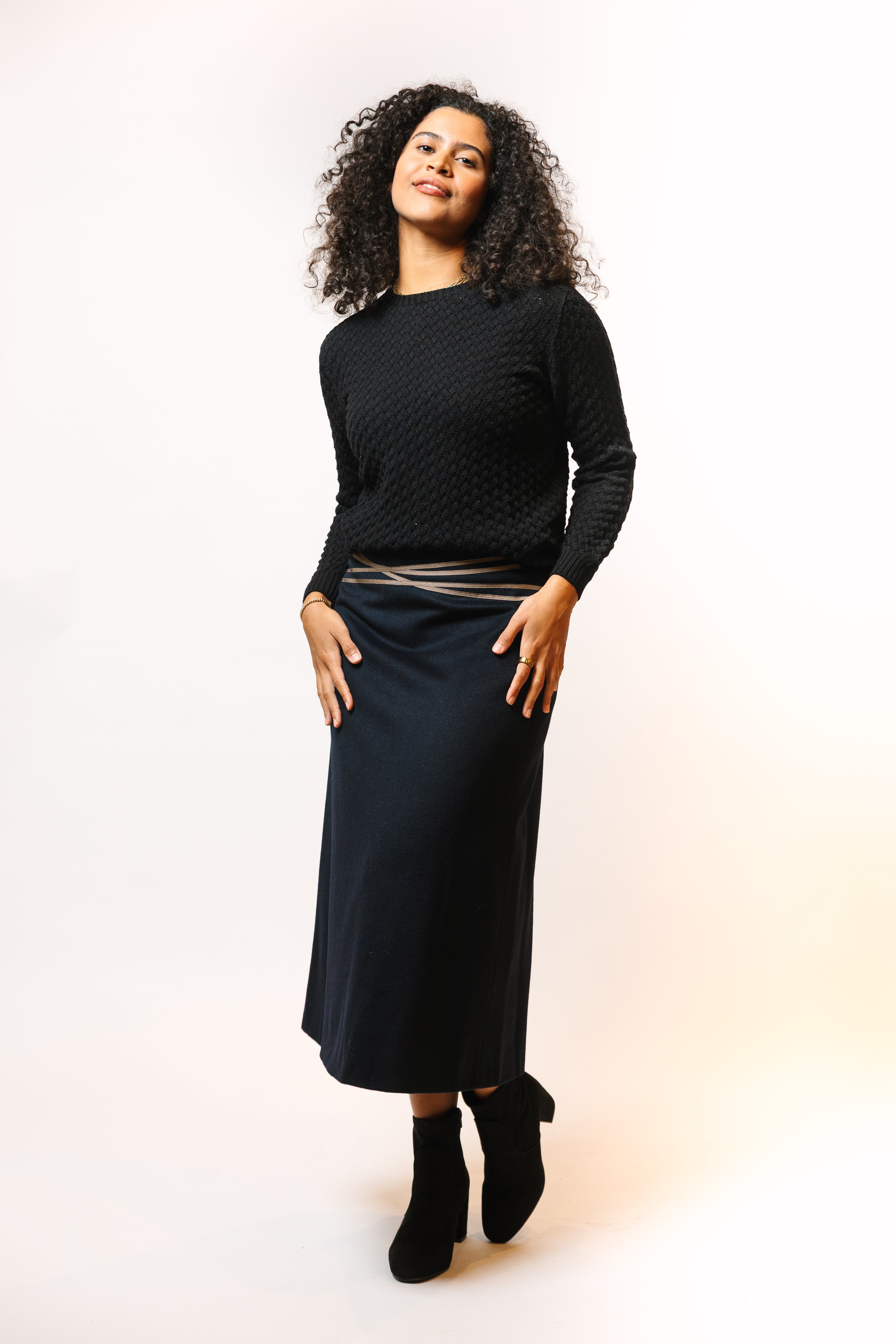 The Winter white taffeta is a fabulous cold weather piece. Throw on the sculpted crew and cropped cardigan, or the Parisian Cashmere V neck, or in spring or fall, pair it with our linen riding jacket. So many options, so flattering, so swishy!